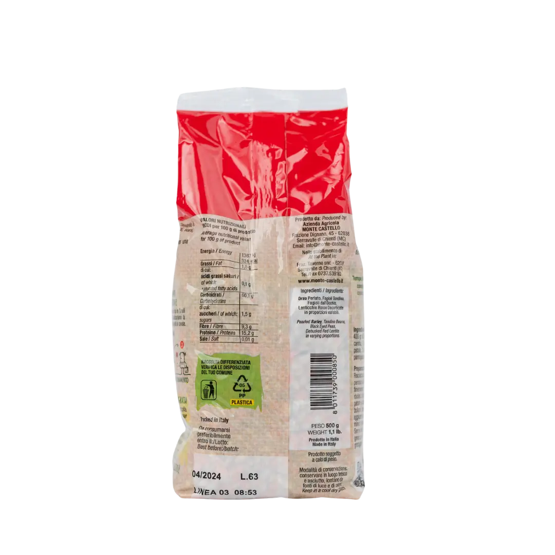 Ingredienti: orzo perlato, fagioli tondino, fagioli dall’occhio e lenticchie rosse decorticate in proporzioni variabili.